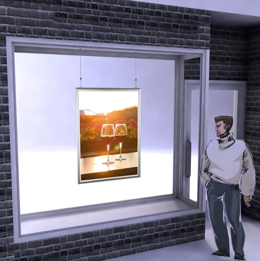 Le cadre peut être fixé verticalement ou horizontalement sur un mur ou une vitrine.