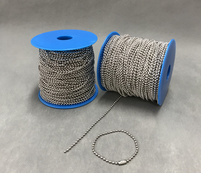 Chaîne à billes métallique à usage polyvalent. Disponible en rouleau, fabriquée en métal nickelé.
