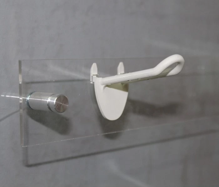 Le crochet est équipé de trois ergots permettant sa fixation (enfoncement) dans le présentoir en carton.