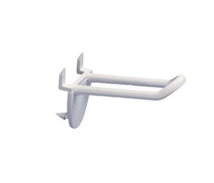 Crochet double blanc pour présentoirs en carton, muni de languettes de sécurité empêchant les produits de tomber.