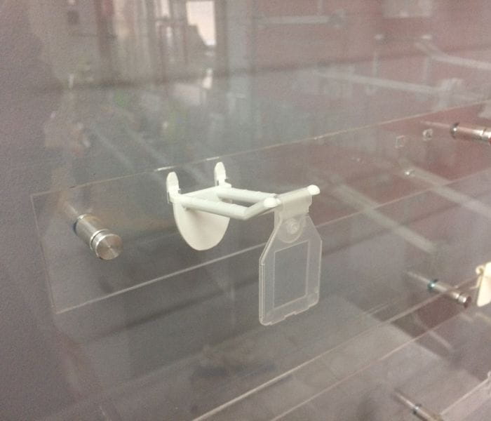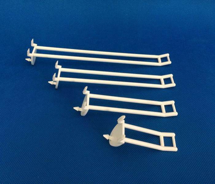 Crochet double à enfoncer pour présentoirs en carton, muni de languettes de sécurité empêchant les produits de tomber.