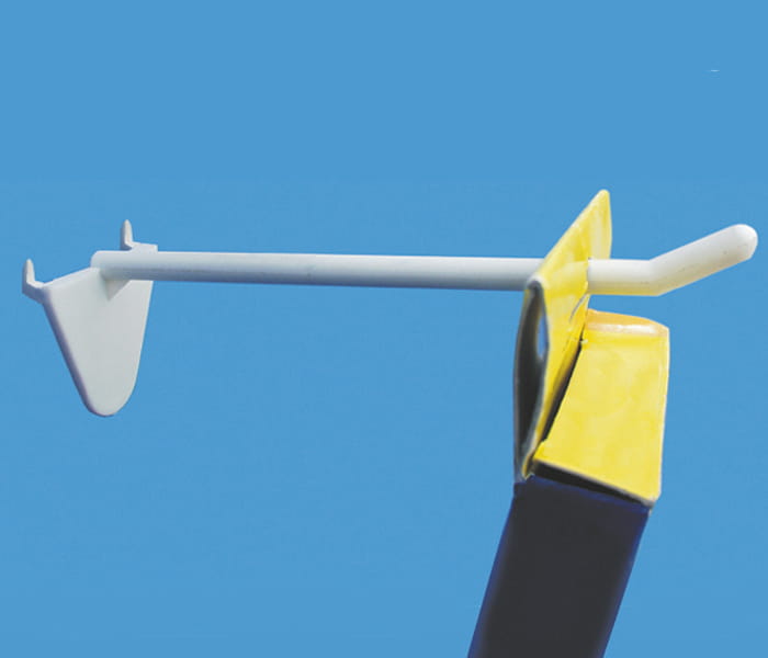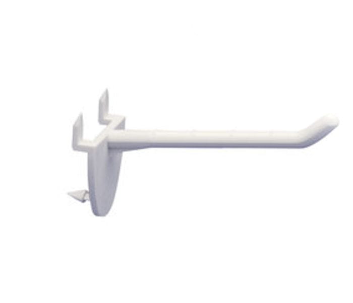 Crochet simple en plastique blanc pour produits, avec tiges de fixation pour présentoirs en carton.