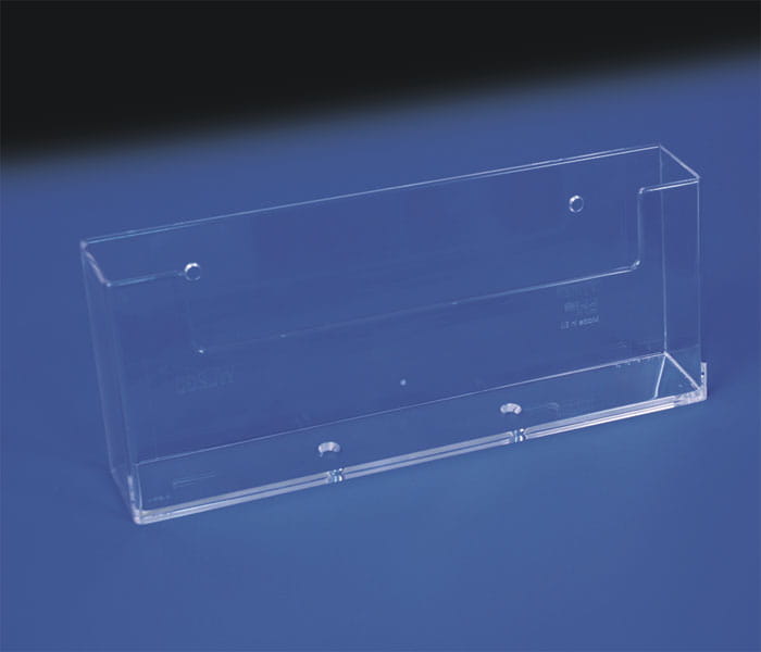 Pochette murale en plexiglas coulé pour brochures format 1/3 A4 (DL) en orientation horizontale.