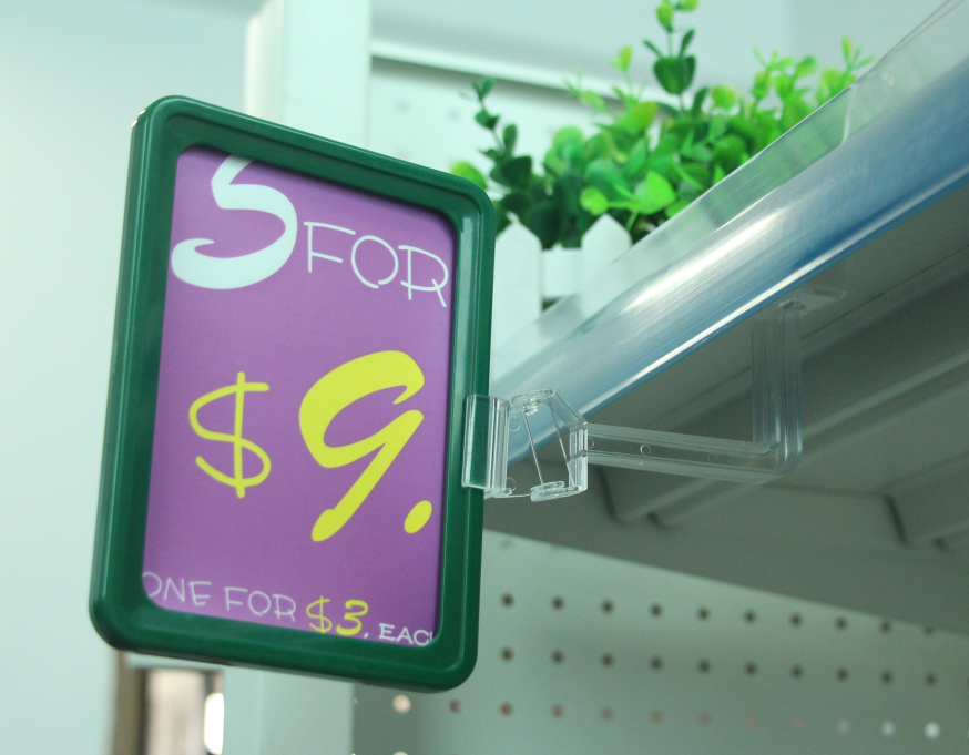 Permet d’exposer un cadre d’affichage sur une étagère métallique sans prendre de place sur l’étagère.